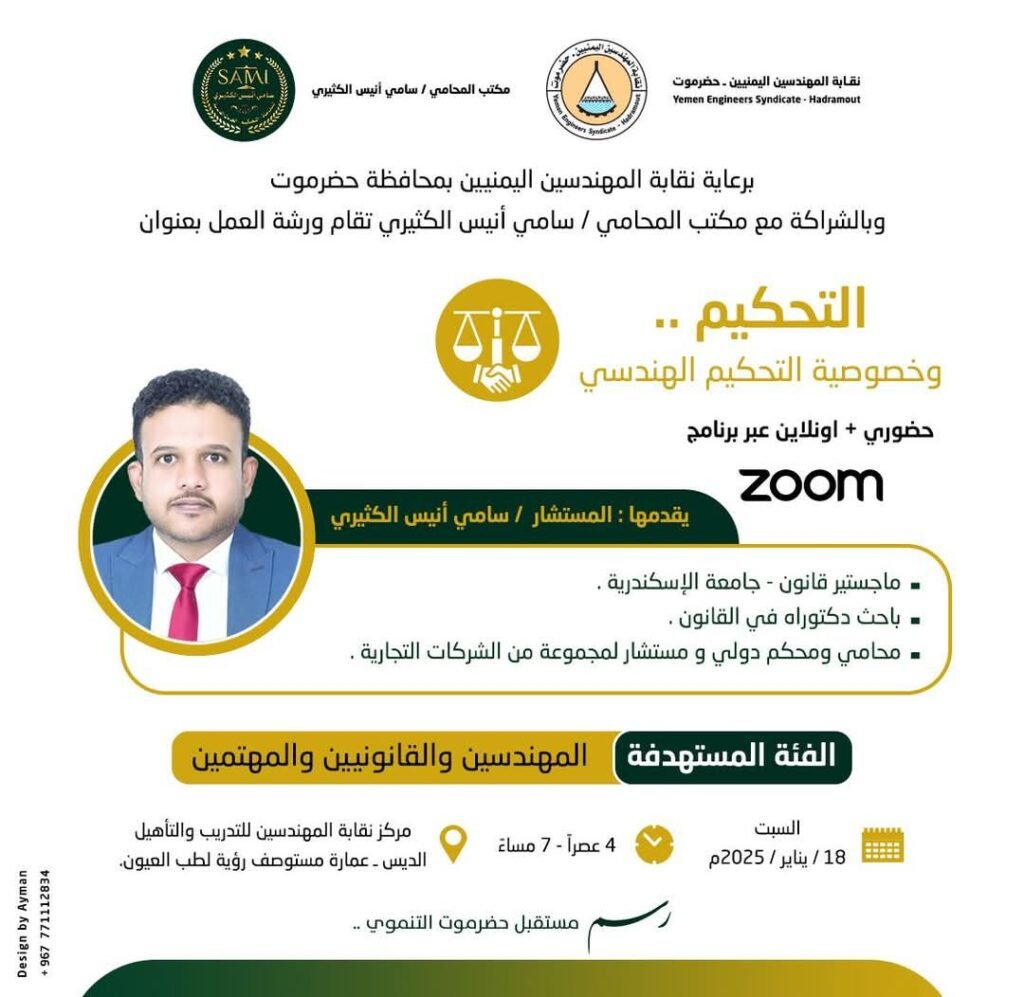 برعاية نقابة المهندسين اليمنيين بمحافظة حضرموت وبالشراكة مع مكتب المحامي / سامي أنيس الكثيري