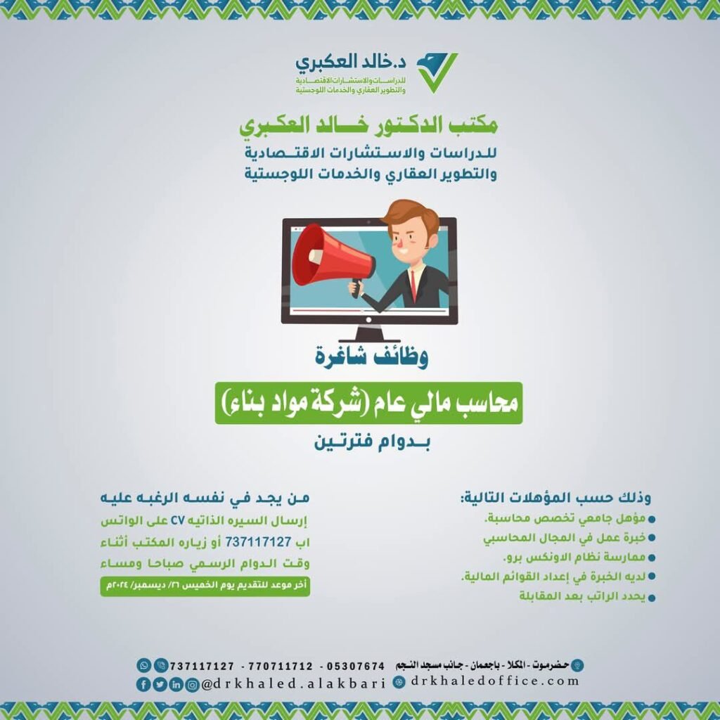 فرصة عمل لمحاسب مالي في مدينة المكلا التفاصيل في صورة الاعلان
