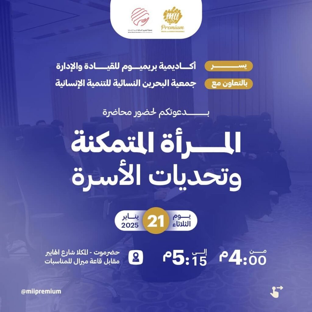 يسر أكاديمية بريميوم للقيادة والإدارة بالتعاون مع جمعية البحرين النسائية للتنمية الإنسانية دعوة المهتمين لحضور المحاضرة القيمة التي تحمل عنوان: