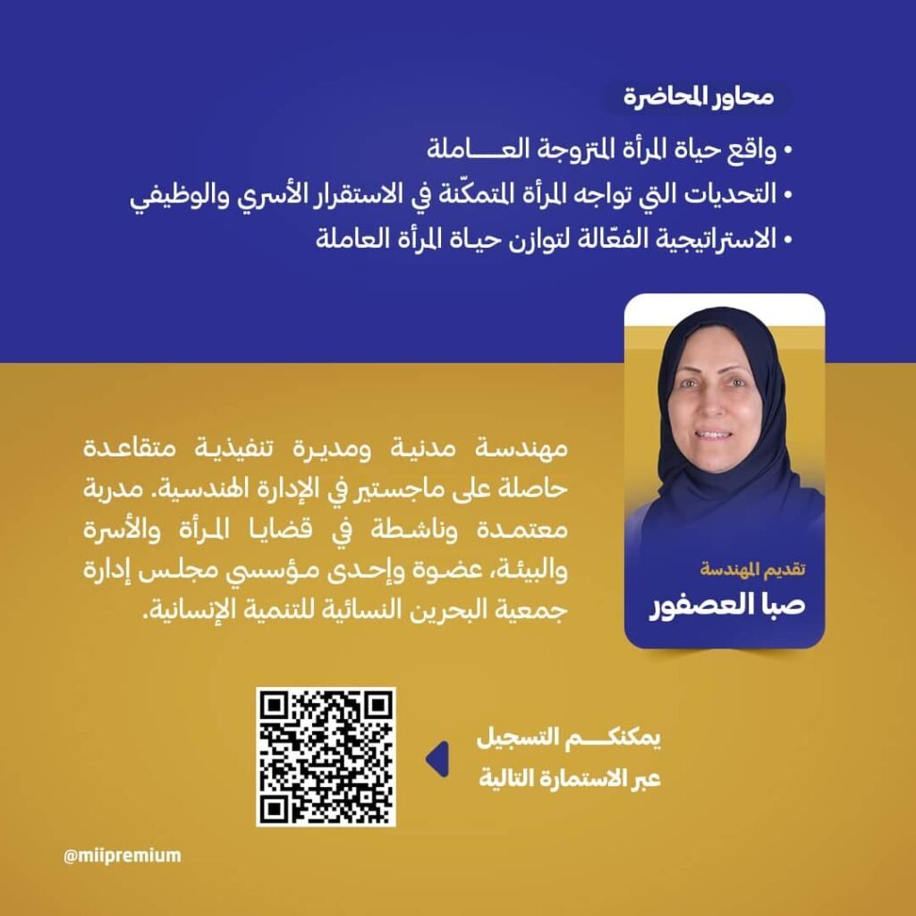 والتي ستقدمها المهندسة صبا العصفور، مهندسة مدنية ومديرة تنفيذية حاصلة على ماجستير في الإدارة الهندسية، تتميز بخبرة مهنية واسعة بدأت منذ عام 1988 وتوجت بتقاعدها في 2016 من منصب مديرة إدارة الخدمات الفنية ببلدية المنطقة الشمالية، مدربة معتمدة وناشطة في قضايا المرأة والأسرة والبيئة، عضوة وإحدى مؤسسي مجلس إدارة جمعية البحرين النسائية للتنمية الإنسانية. كانت من أوائل المترشحات للمجالس البلدية عام 2002 وأول امرأة تنضم للجنة تنظيم ومزاولة المهن الهندسية في البحرين، وتم تكريمها في يوم المرأة البحرينية 2016.