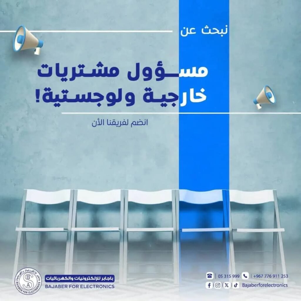 تعلن مؤسسة باجابر للالكترونيات والكهربائيات عن فتح باب التوظيفة لوظيفة *”مسؤول مشتريات خارجية ولوجستيات”*