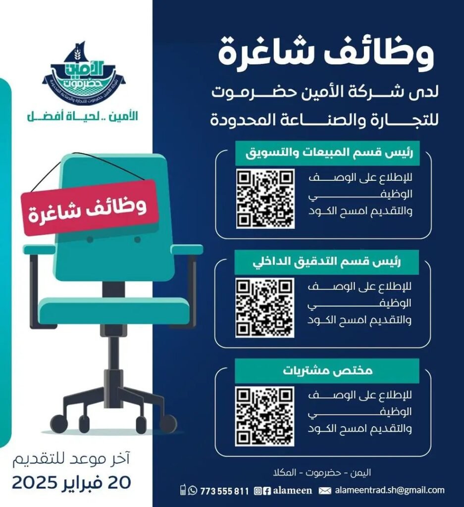 تعلن شركة الأمين حضرموت للتجارة والصناعة المحدودة عن توفر عدد من الوظائف القيادية الشاغرة.